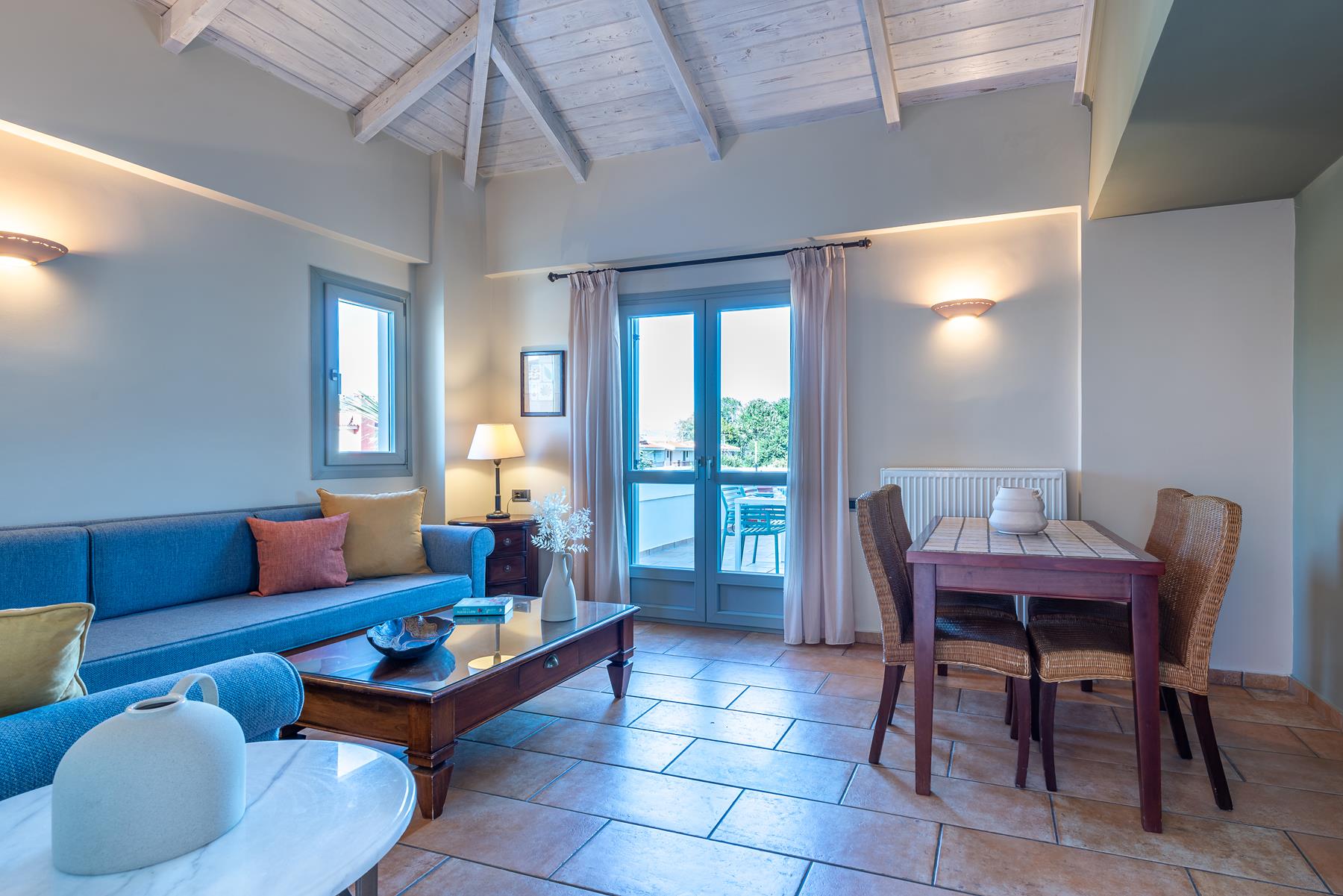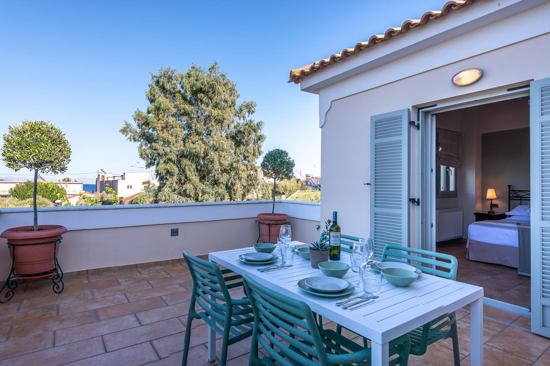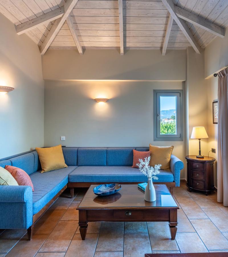 The discreet elegance combined with the highly functional layout give this apartment a sense of luxury and comfort. Ideal for a couple but also for a family, located on the top level, one floor above the pool. A special advantage is its very large terrace with beautiful view of the green landscape of the area and the sea in the background. It has a living room and dining area in an open space, a bright and functional kitchen in a discreet position, a large bedroom with a king-size bed and a beautiful bathroom with natural materials such as marble and wood. The two sofas in the living room have anatomical mattresses and ensure excellent sleep quality. On the large terrace that is adjacent to the living room and the bedroom you will enjoy romantic but also happy family moments.