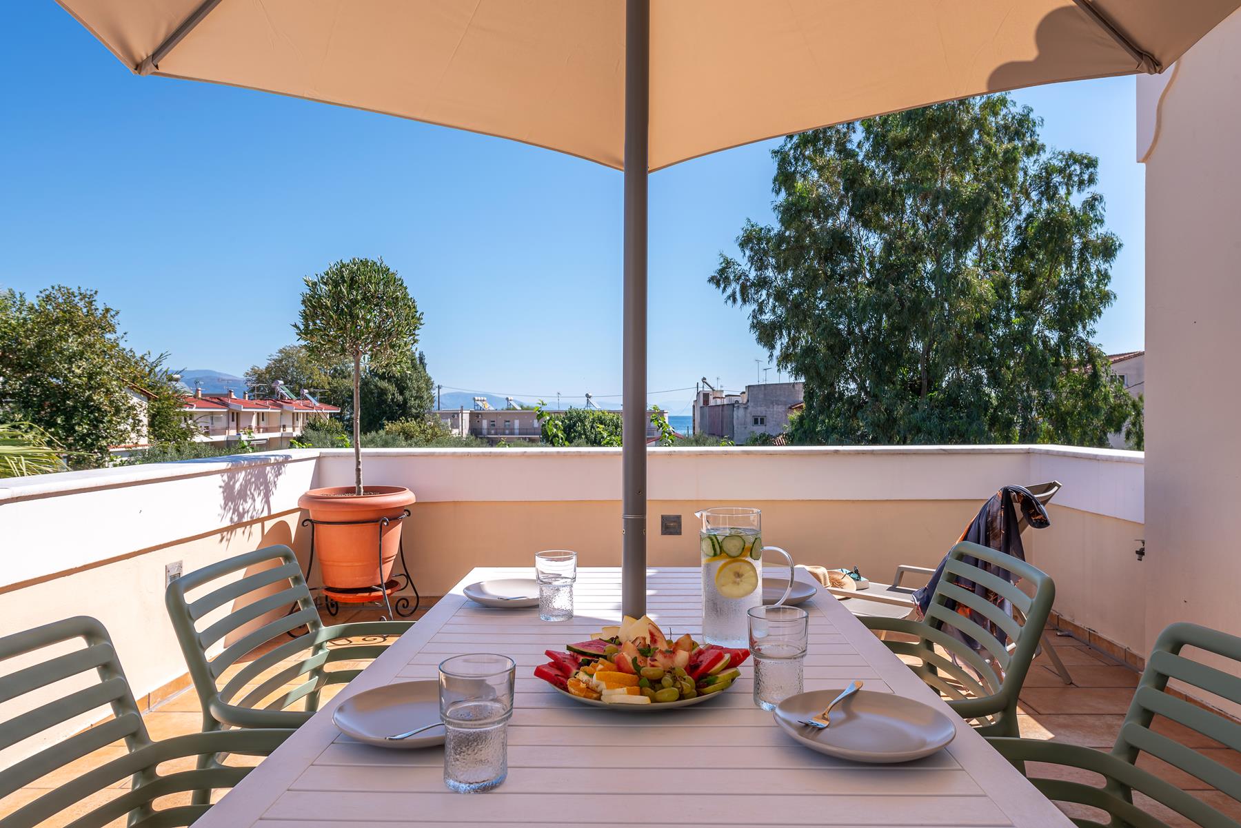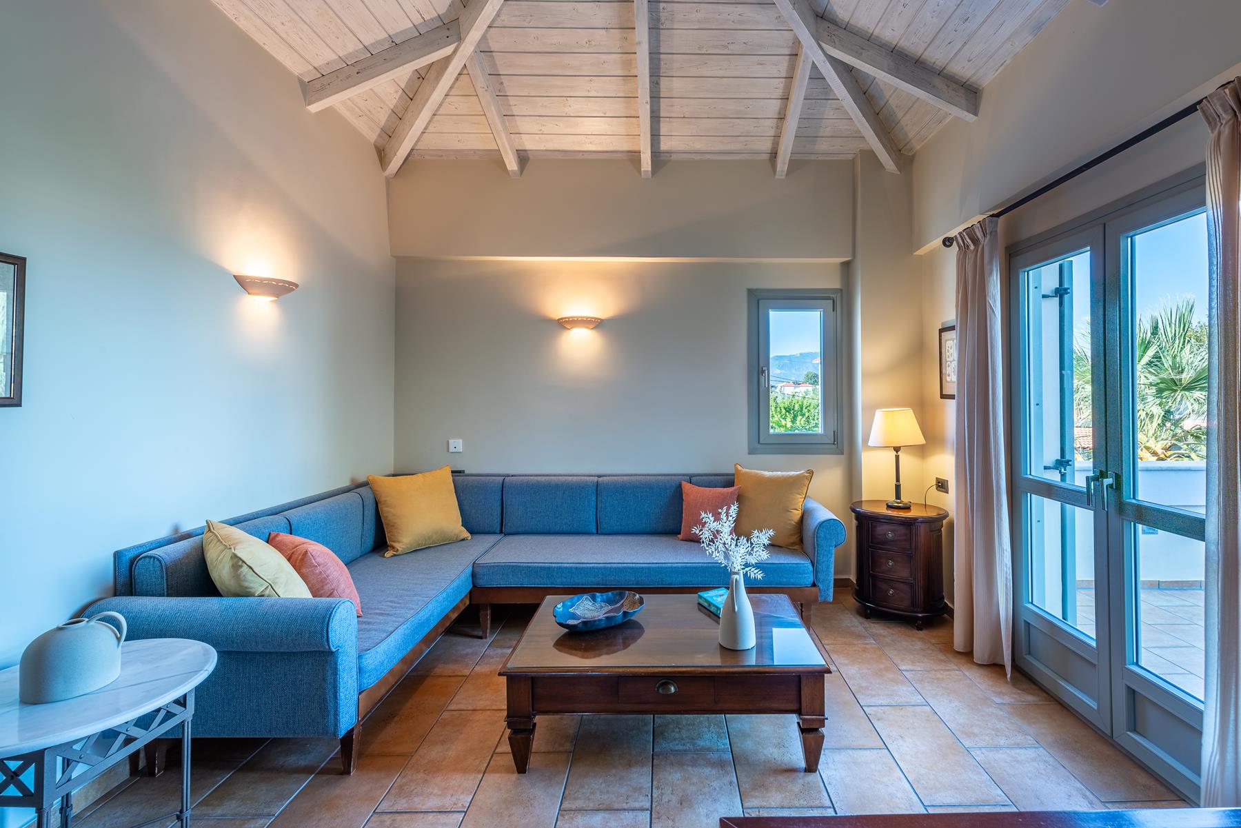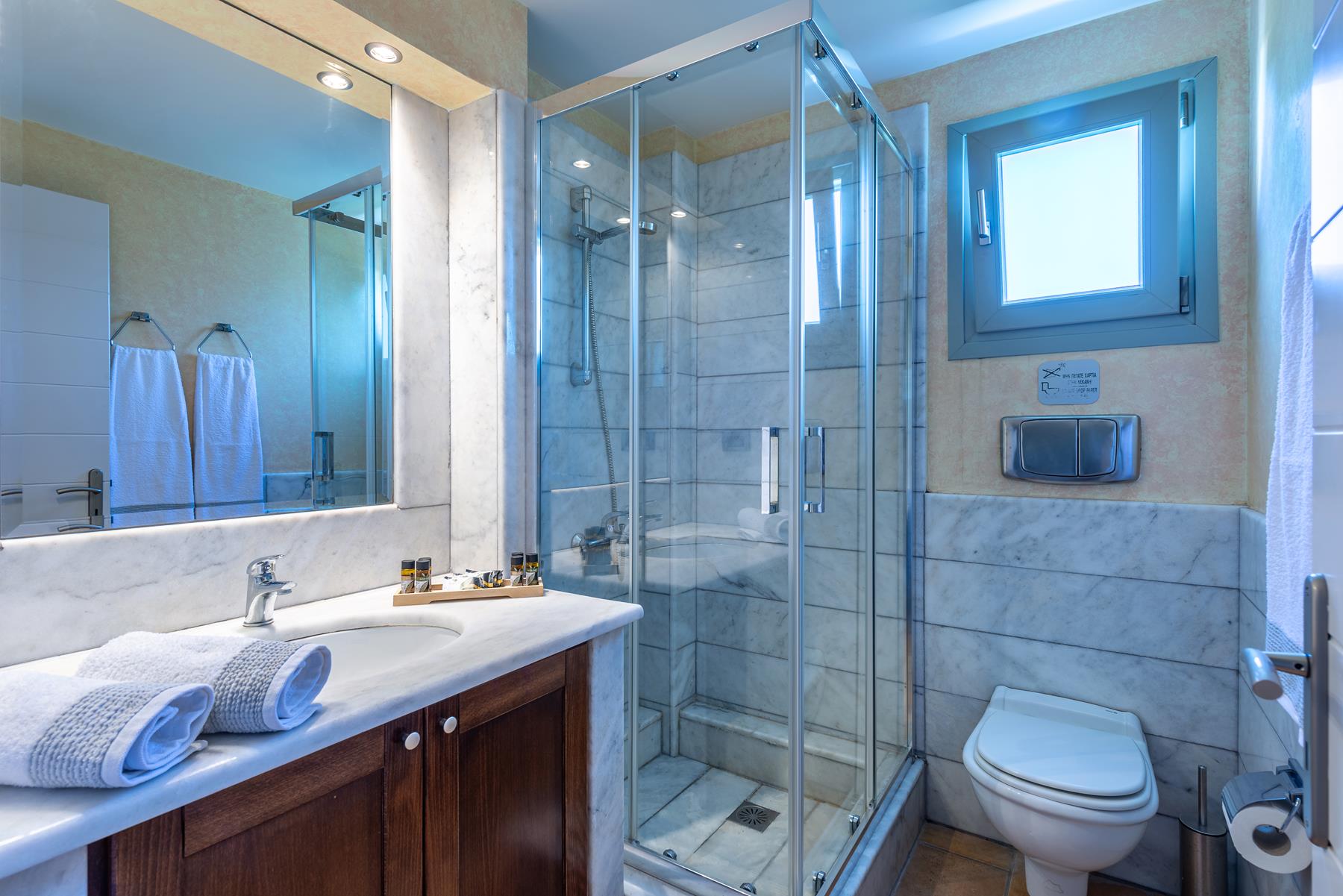 The discreet elegance combined with the highly functional layout give this apartment a sense of luxury and comfort. Ideal for a couple but also for a family, located on the top level, one floor above the pool. A special advantage is its very large terrace with beautiful view of the green landscape of the area and the sea in the background. It has a living room and dining area in an open space, a bright and functional kitchen in a discreet position, a large bedroom with a king-size bed and a beautiful bathroom with natural materials such as marble and wood. The two sofas in the living room have anatomical mattresses and ensure excellent sleep quality. On the large terrace that is adjacent to the living room and the bedroom you will enjoy romantic but also happy family moments.