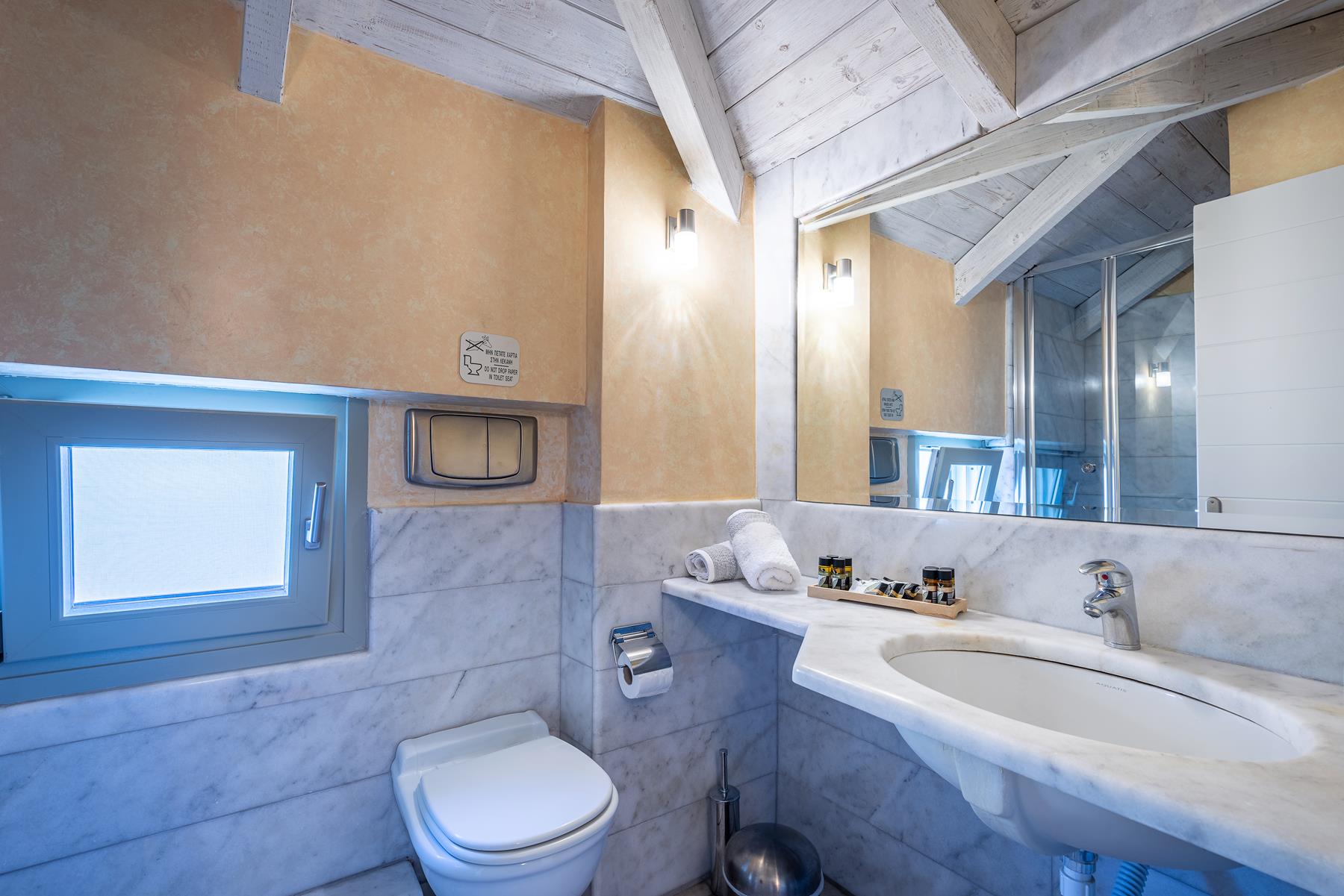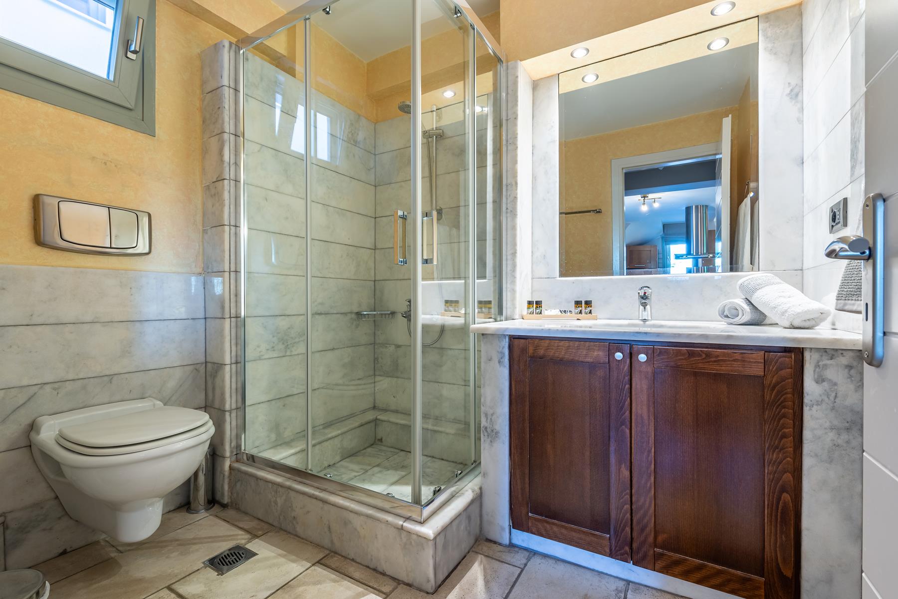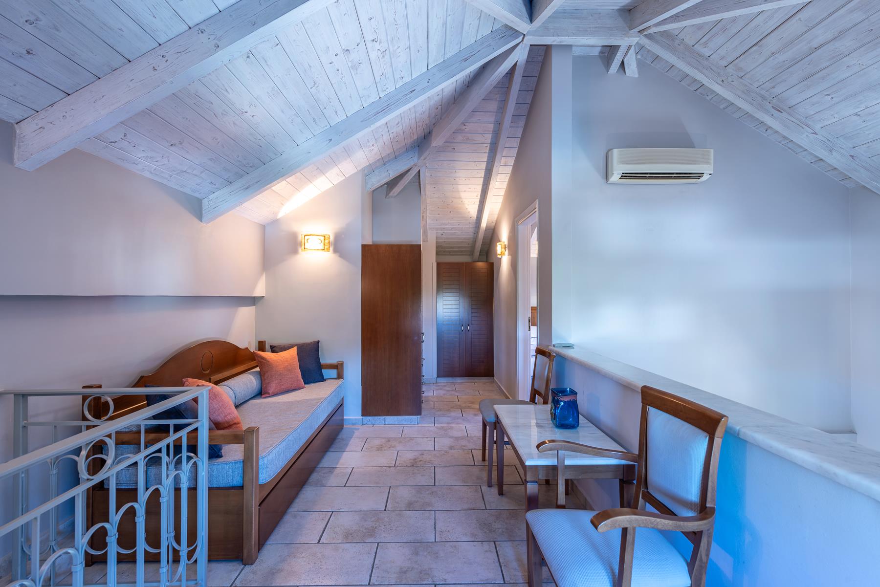 On the main level is the living room, the dining room in contact with the fully equipped kitchen, a bedroom with a king-size bed and a bathroom. The largecovered terrace adjacent to the living room and the bedroom offers you the opportunity to enjoy happy family moments. A marble staircase leads to the attic featuring a second living room in visual contact with the living room of the main level, a separate bedroom with twin beds and a bathroom.