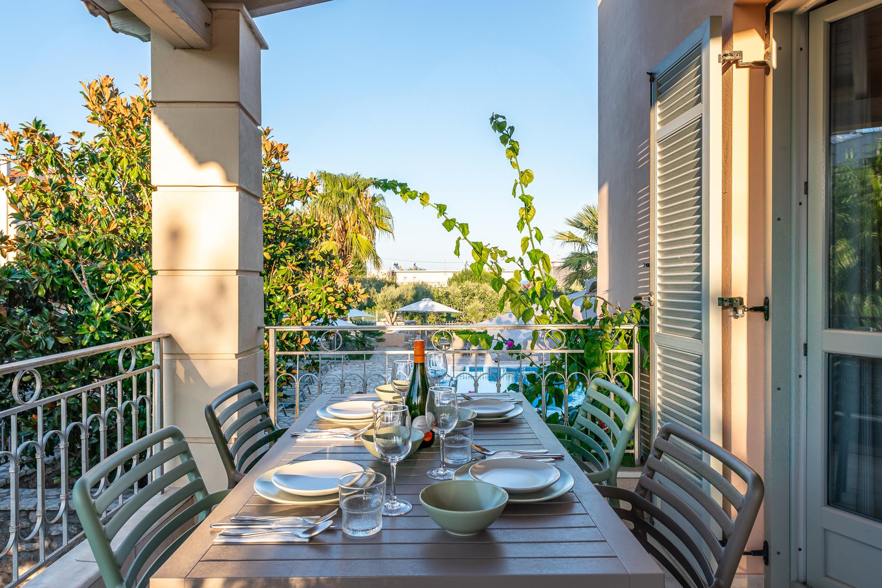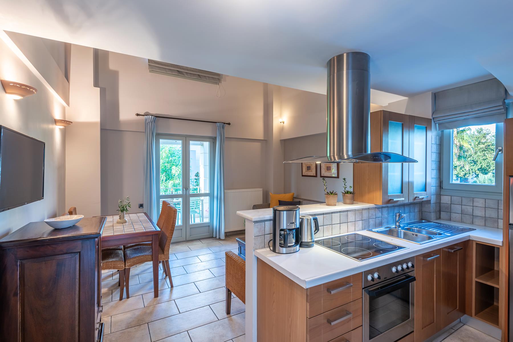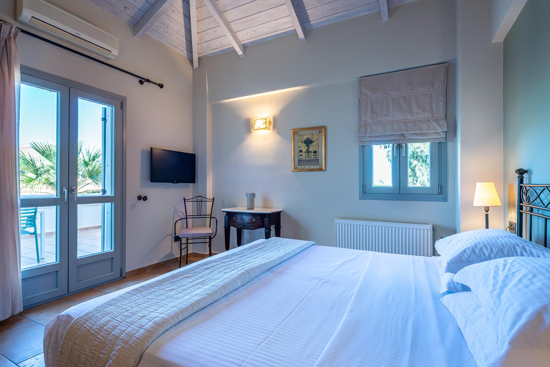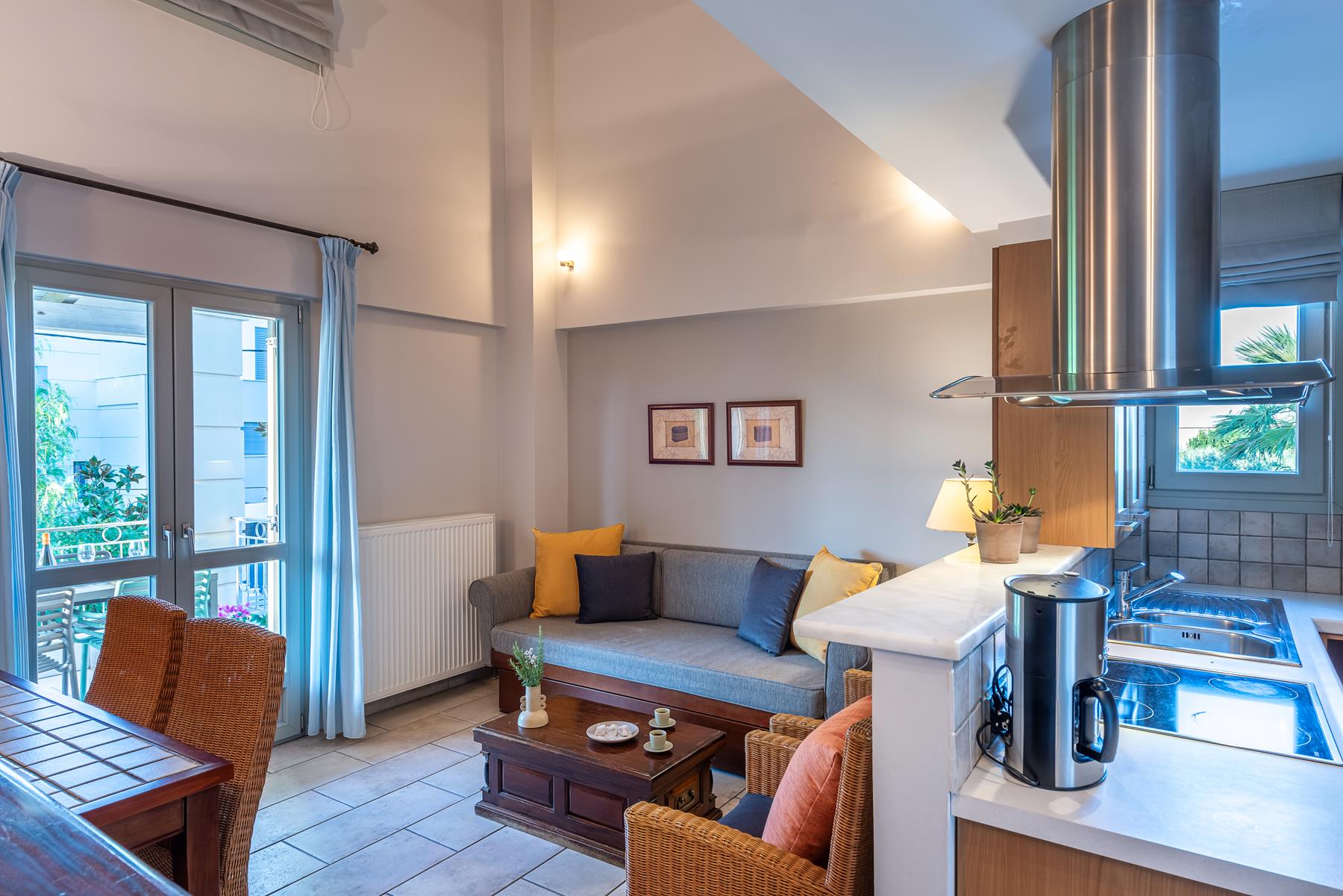 On the main level is the living room, the dining room in contact with the fully equipped kitchen, a bedroom with a king-size bed and a bathroom. The largecovered terrace adjacent to the living room and the bedroom offers you the opportunity to enjoy happy family moments. A marble staircase leads to the attic featuring a second living room in visual contact with the living room of the main level, a separate bedroom with twin beds and a bathroom.